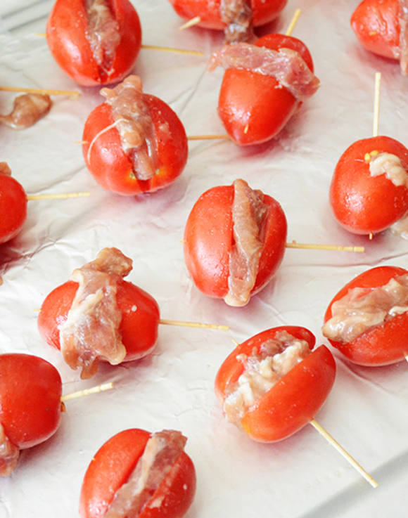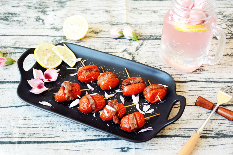 • 材料: 圣農(nóng)一整塊牛排1包 圣女果20個 黑胡椒粉少許 細(xì)鹽少許 橄欖油視情況而定 步驟: 圣女果洗凈,中間切口(不要切斷) 一整塊牛排完全解凍,平均切成20個牛肉丁 將牛肉丁塞入圣女果,用牙簽串好固定 油的錫紙烤盤上擺好,撒上黑胡椒 刷一層橄欖油 放入預(yù)熱好的烤箱190度中層上下火烤10分鐘