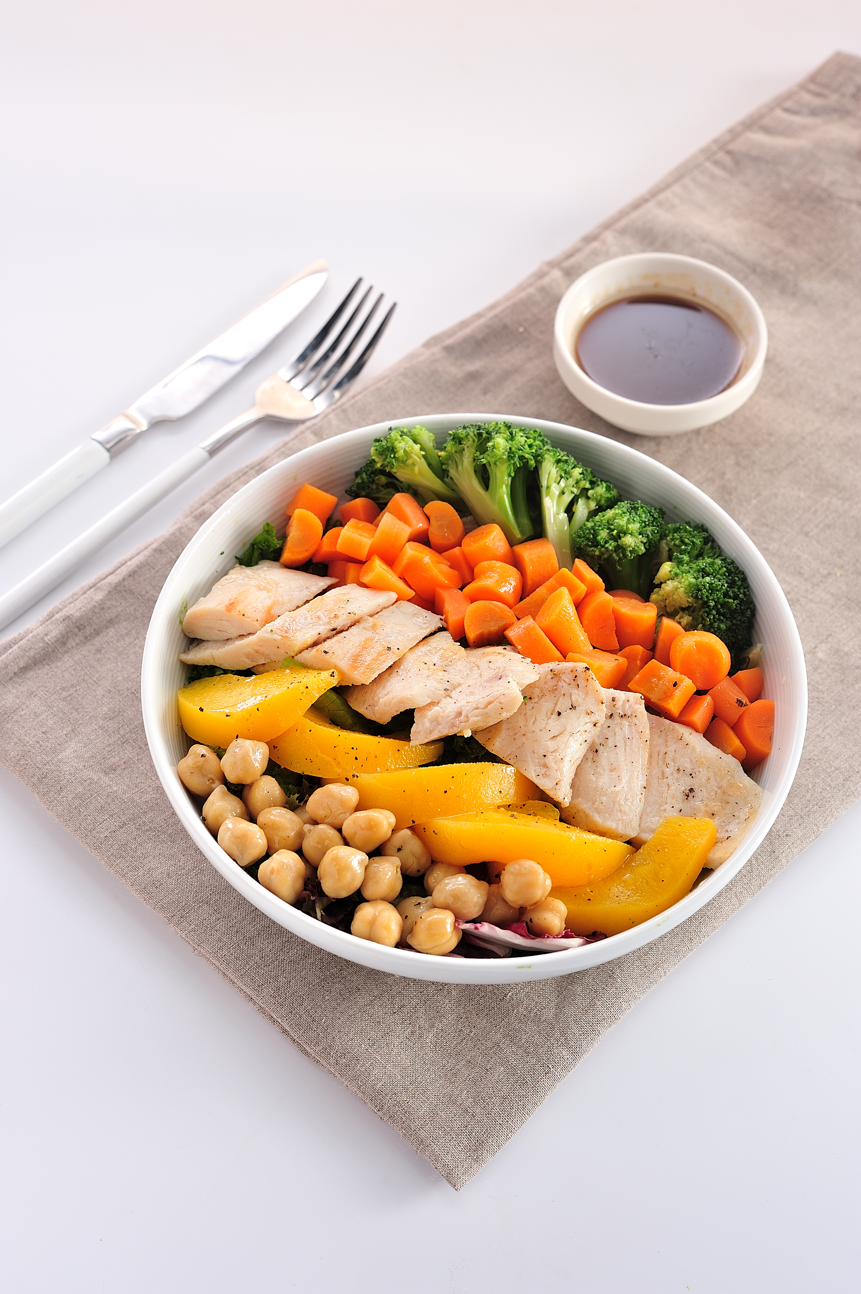 • 材料: 4度°雞胸肉1塊  雞蛋1顆 胡蘿卜50克 西蘭花50克 芒果40克 鷹嘴豆50克 生菜50克 圣農(nóng)  步驟: 鷹嘴豆提前一晚泡發(fā),第二天煮10分鐘撈出 圣農(nóng)4度°雞胸肉水煮3分鐘后切塊 胡蘿卜、雞蛋、芒果切塊 盤底鋪上生菜后,按順序放上西蘭花、胡蘿卜、雞胸肉、芒果及鷹嘴豆即可